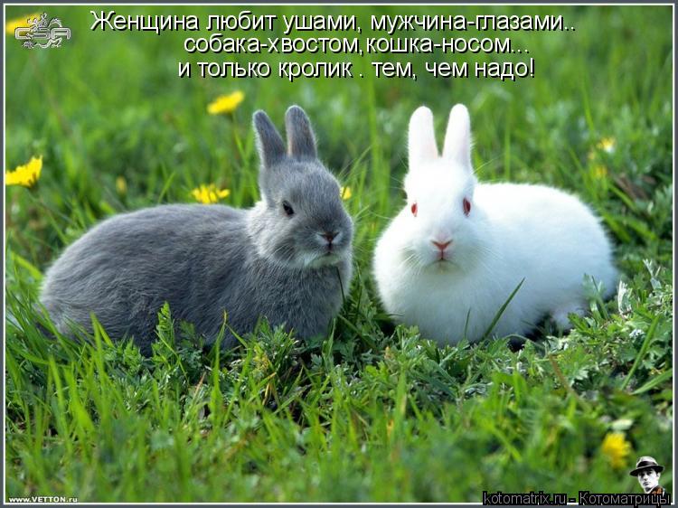| Женщина любит ушами, мужчина - глазами, собака - носом и только кролик |